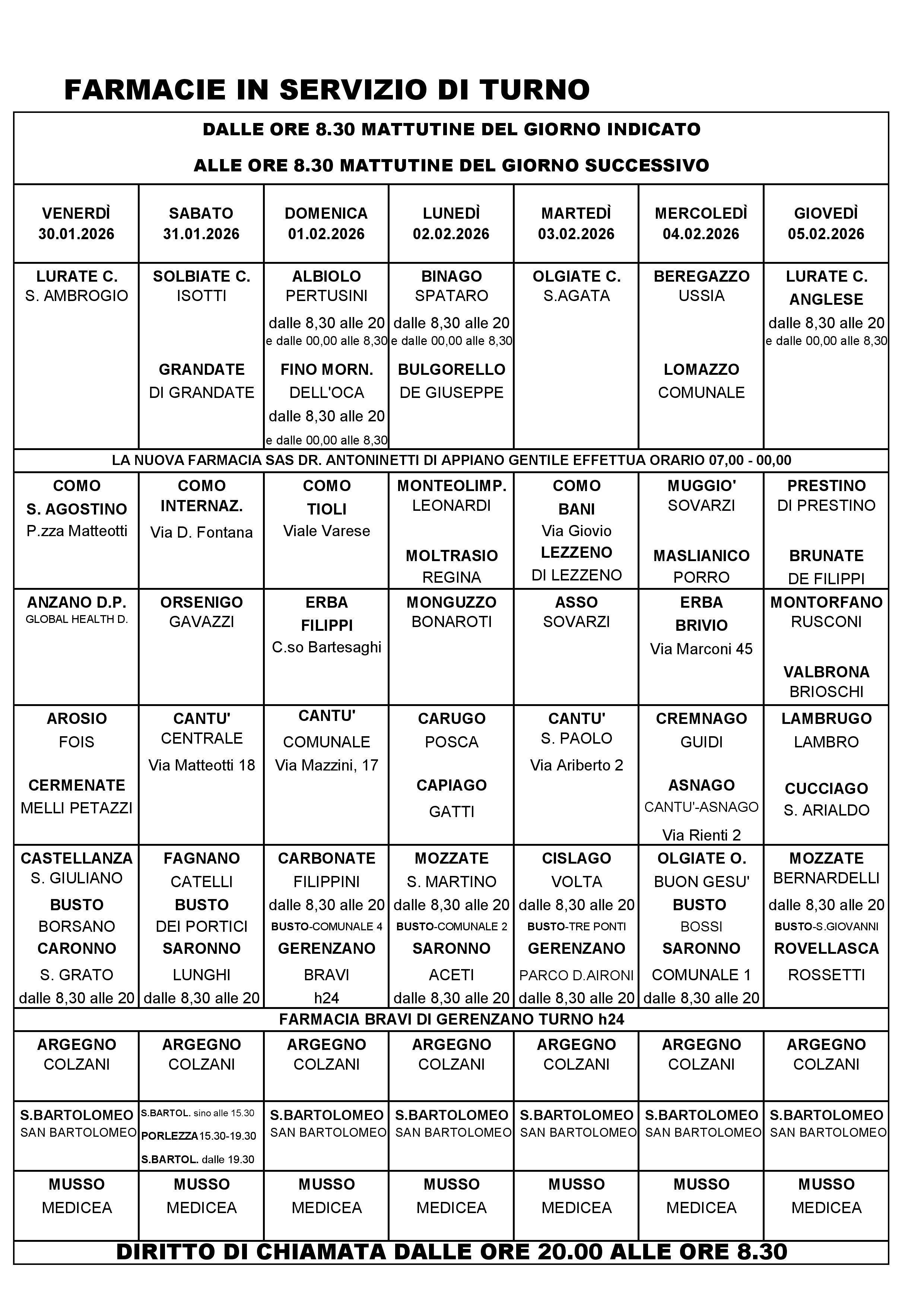 Il turno diurno del 1 febbraio 2026 sarà effettuato dalla Farmacia La Nuova Farmacia di Appiano Gentile anziché dalla Farmacia Pertusini di Albiolo.